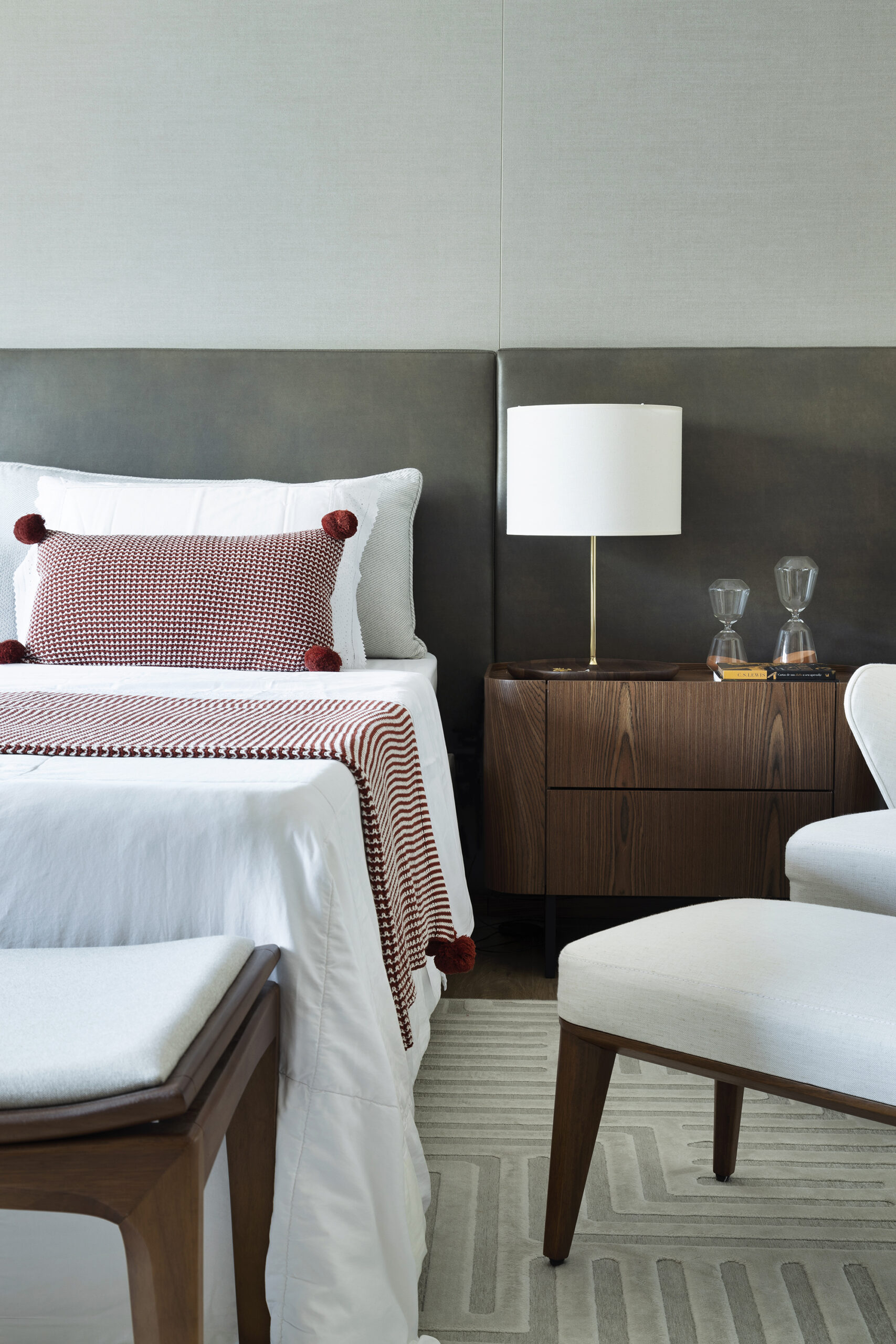 Ainda neste pavimento, a área íntima passou por uma reconfiguração significativa. A suíte do casal foi ampliada com a incorporação de um dos dormitórios, resultando em um layout mais generoso, com closet espaçoso e um banheiro pensado como área de bem-estar, que inclui sauna úmida.